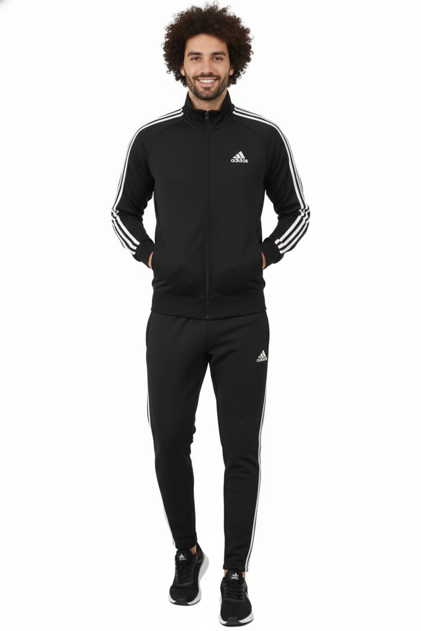 Design: Features a full-zip closure, a sleek stand-up collar, and bold black double stripes running down the sleeves.