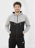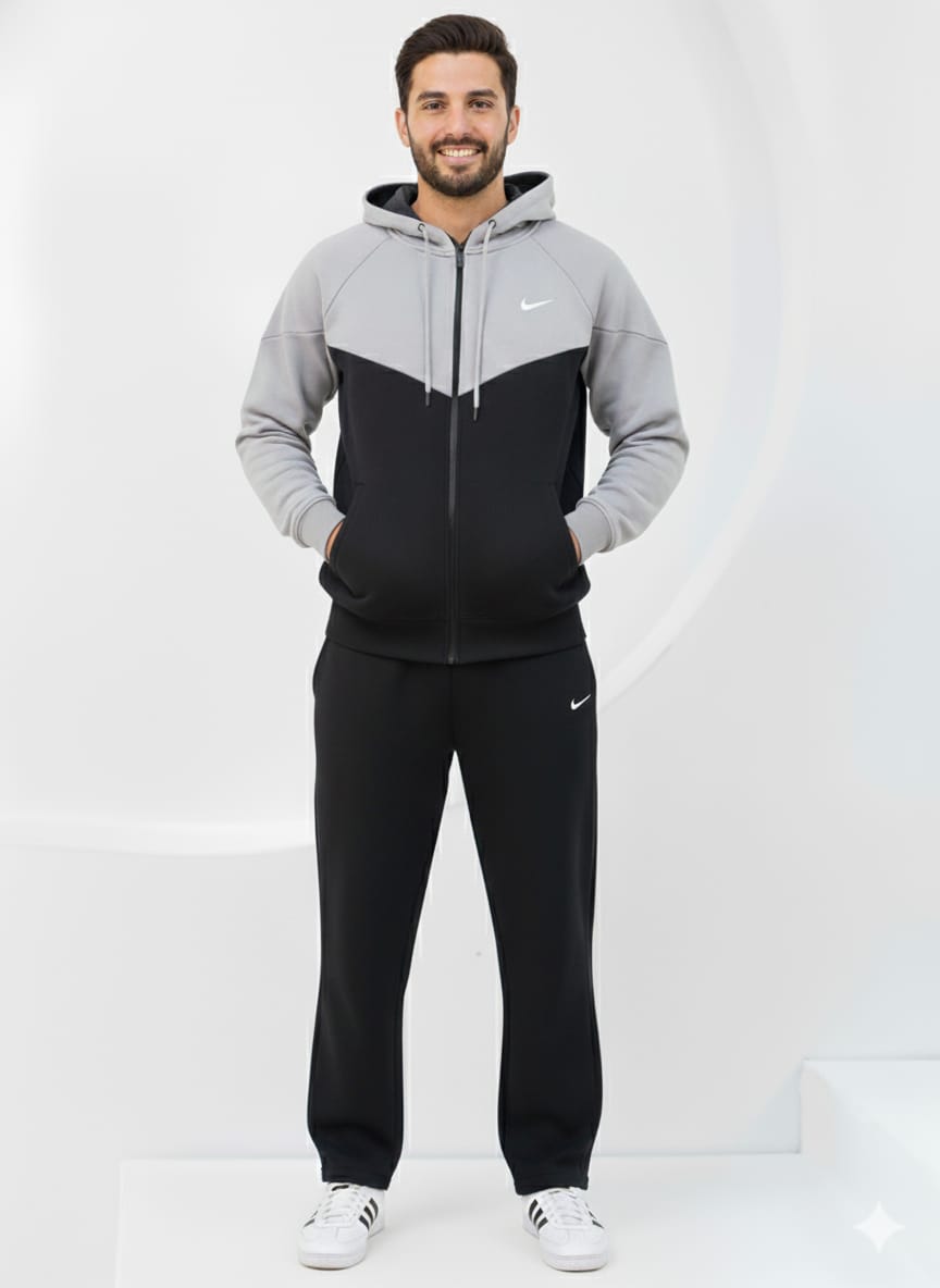 Jacket (Hoodie): Features a sleek and stylish Grey and Black Chevron (Color-Block) design with the classic Nike Swoosh logo on the chest. This full-zip hoodie offers a comfortable and adjustable fit.
